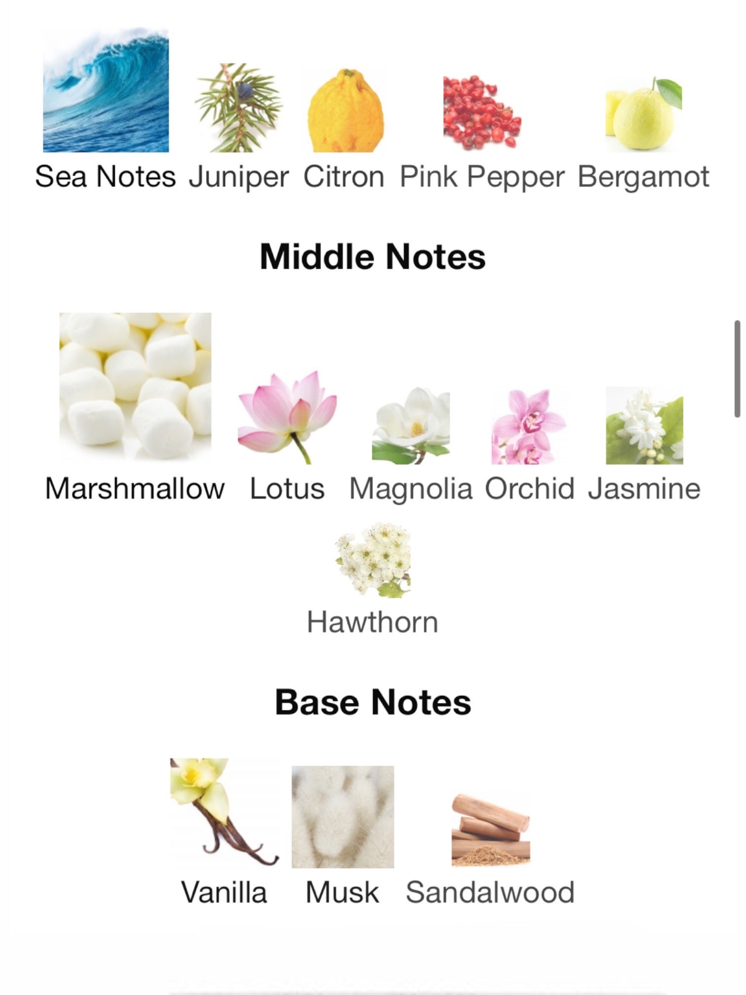 The perfume opens with notes of sea spray and fresh citruses. The heart is made of a feminine bouquet of white flowers and all is resting on notes of weightless marshmallow, sandalwood and white musks.