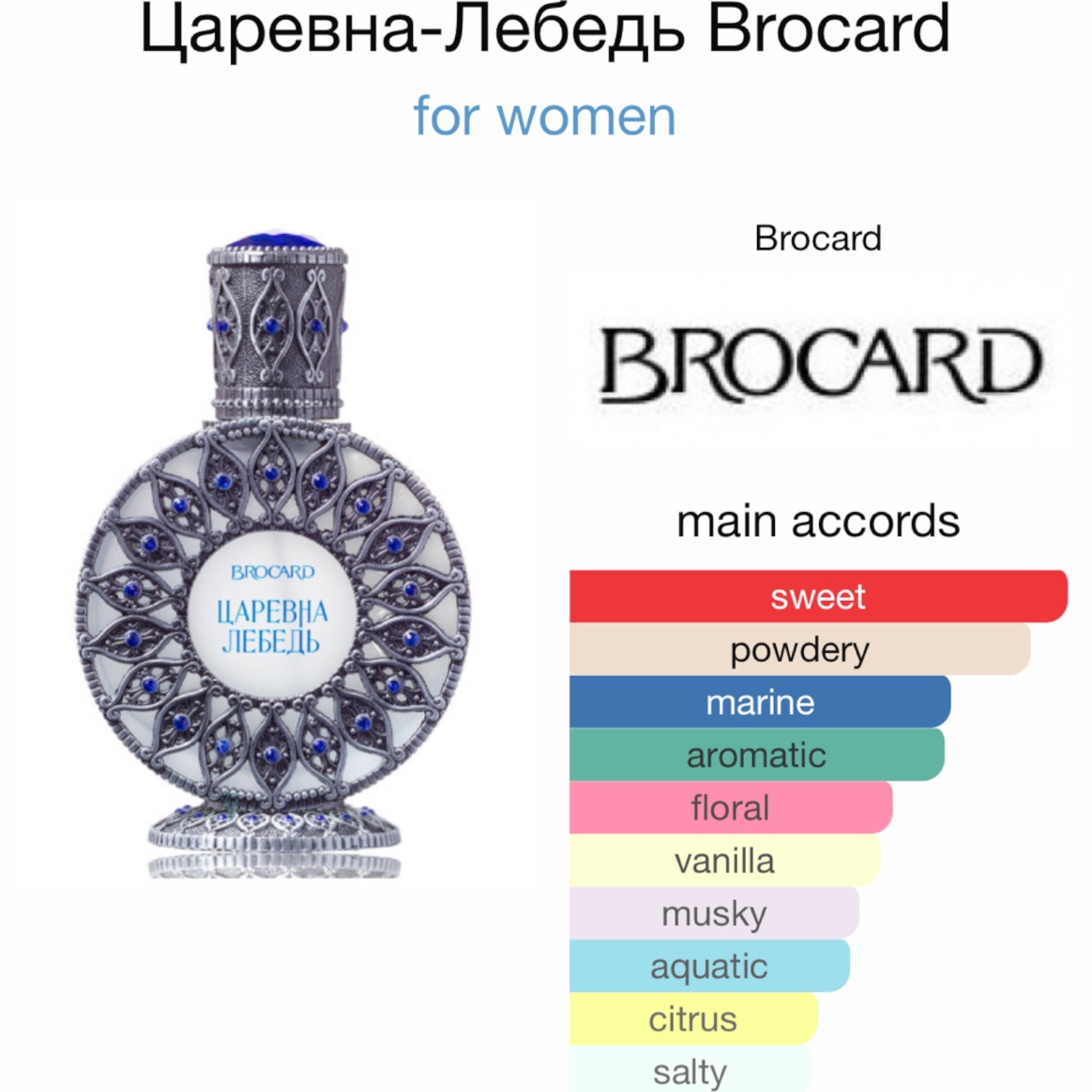 Царевна-Лебедь by Brocard is a Floral Woody Musk fragrance for women. Царевна-Лебедь was launched in 2017. The nose behind this fragrance is Bertrand Duchaufour. Top notes are Sea Notes, Juniper, Citron, Pink Pepper and Bergamot; middle notes are Marshmallow, Lotus, Magnolia, Orchid, Jasmine and Hawthorn; base notes are Vanilla, Musk and Sandalwood.