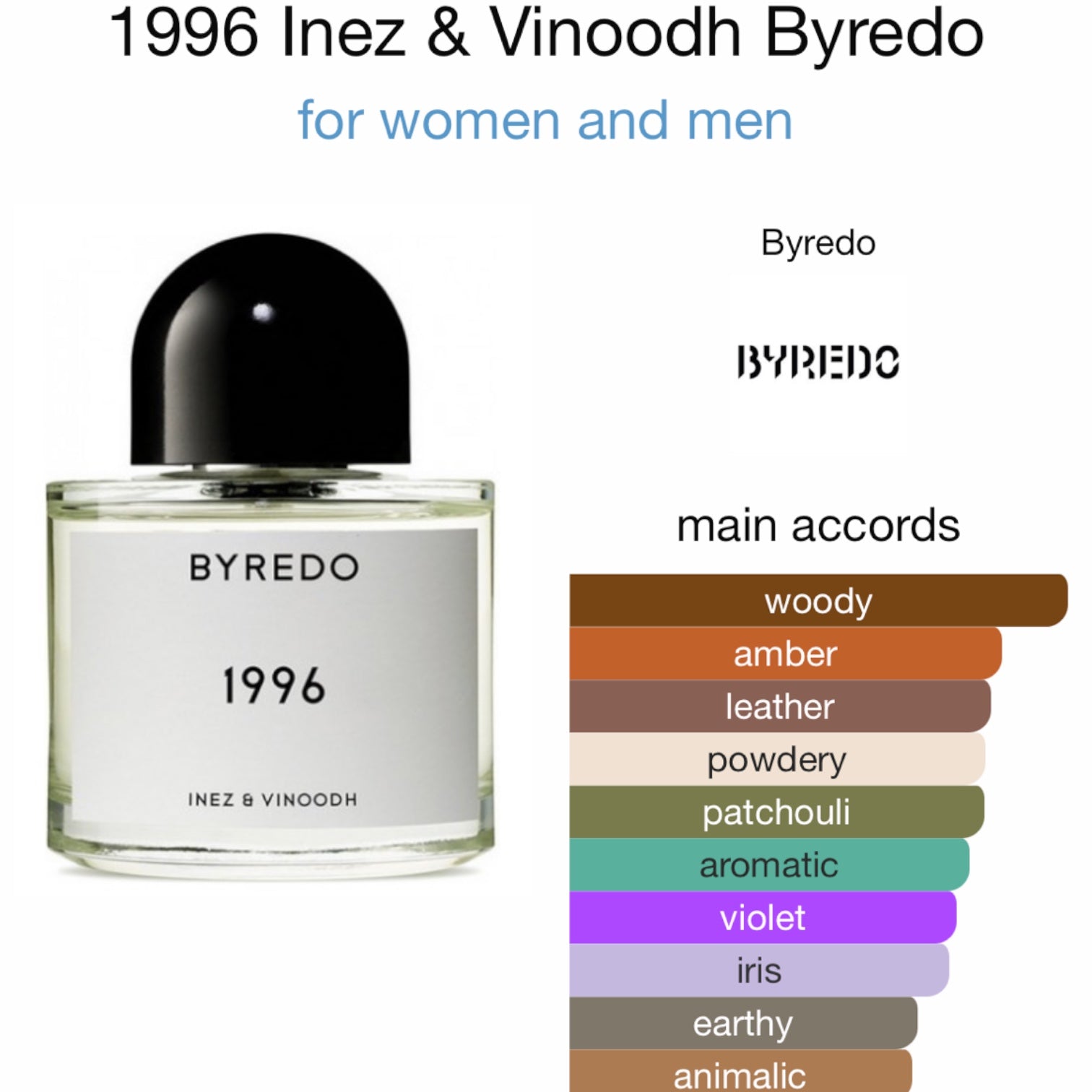 1996 Inez & Vinoodh by Byredo is a Amber Woody fragrance for women and men. 1996 Inez & Vinoodhwas launched in 2013. Top note is Juniper Berries; middle notes are Iris and Violet; base notes are Amber, Leather and Patchouli.