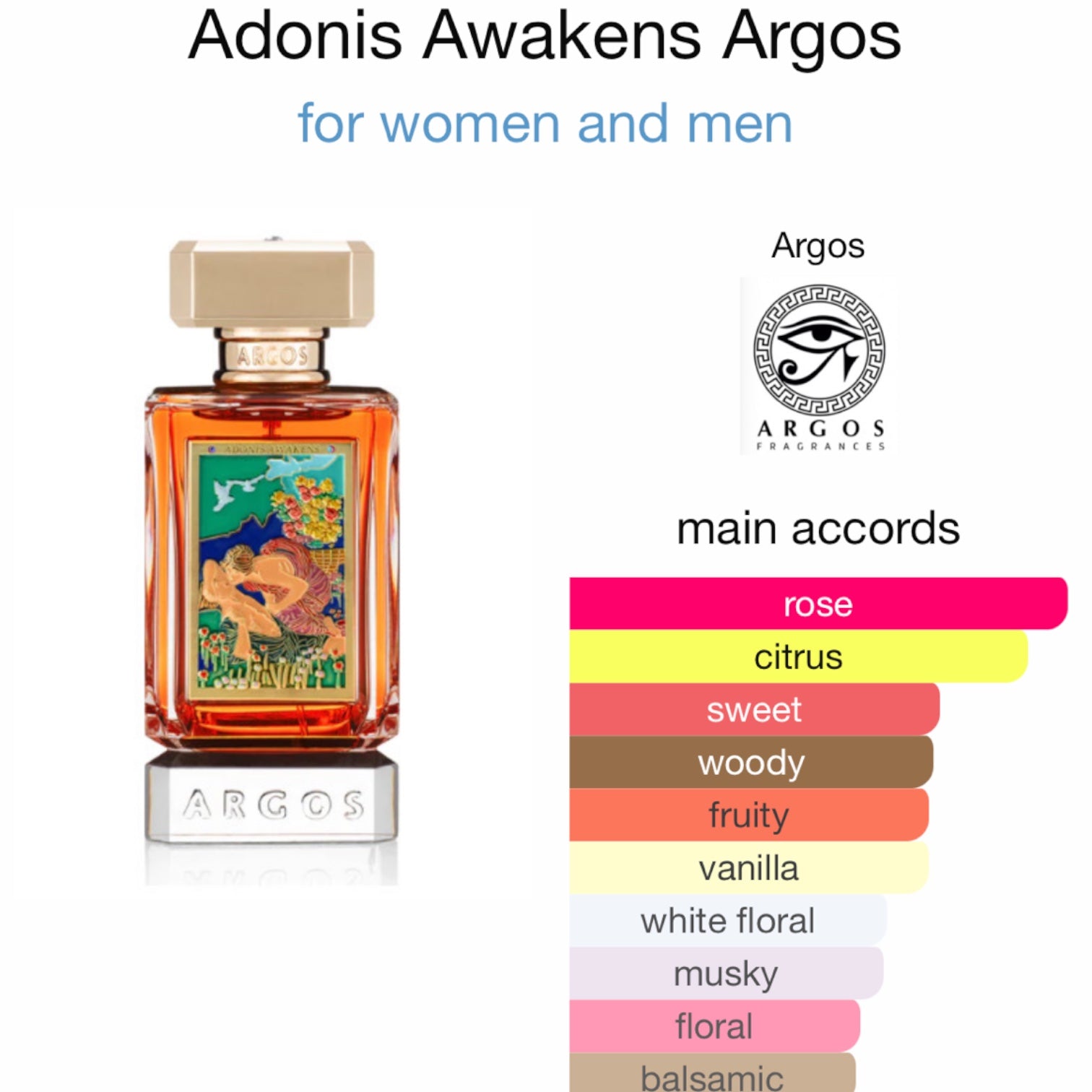 Adonis Awakens by Argos is a fragrance for women and men. This is a new fragrance. Adonis Awakens was launched in 2022. Top notes are Grapefruit, Bergamot and Pink Pepper; middle notes are Bulgarian Rose, Raspberry, Vanilla, Jasmine Sambac and Chestnut; base notes are Rose, Cashmere Wood and Mysore Sandalwood.