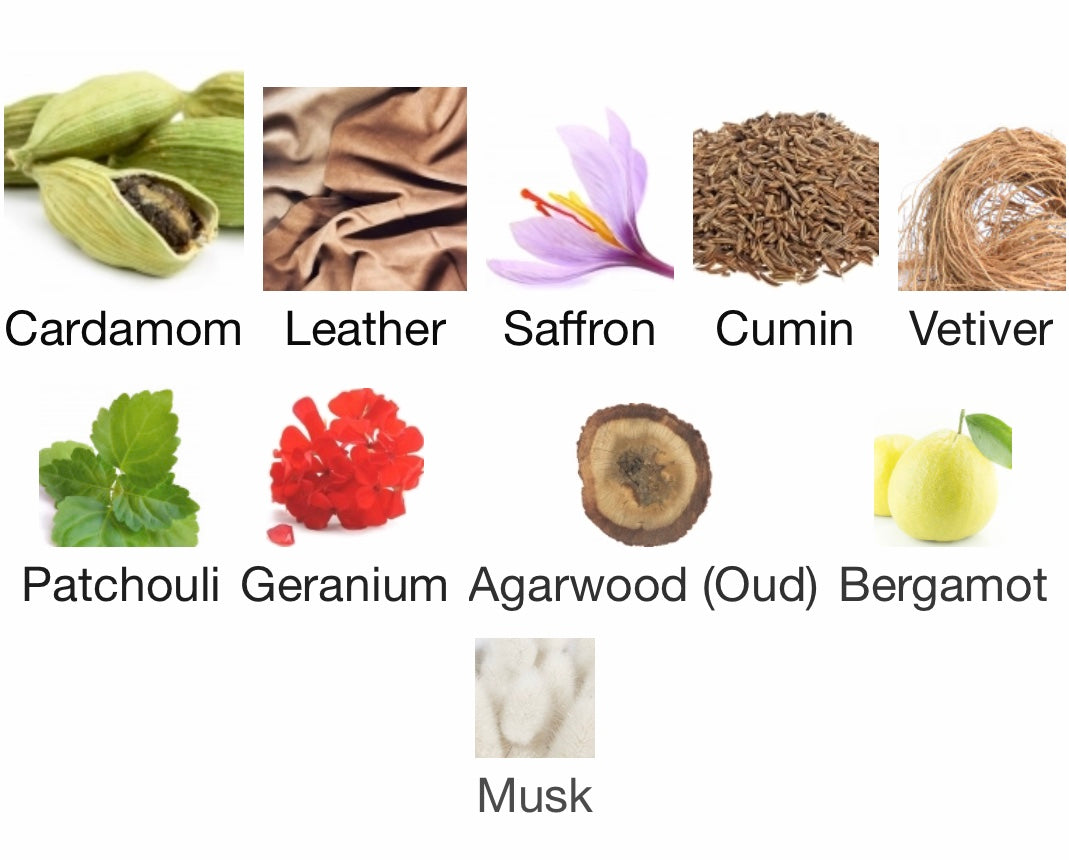 Notes: cardamom, geranium and leather; additional notes include bergamot, saffron, cumin, patchouli, oud accord, vetiver and musk.