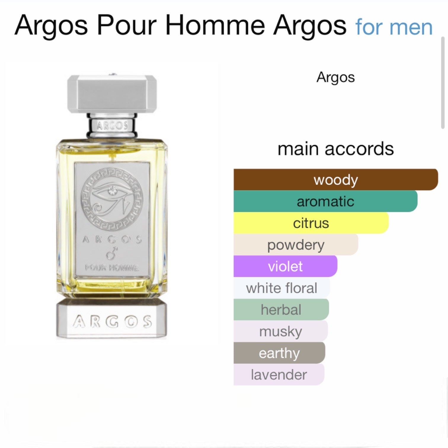 Argos Pour Homme diffuses well, is clean, elegant, and not overpowering. Argos Pour Homme is truly remarkable and memorable scent. This scent is versatile. Argos Pour Homme is great for casual occasions such as lunch with friends, a day at the office or a night on the town. Argos Pour Homme transports you to another world of opulence and luxury.