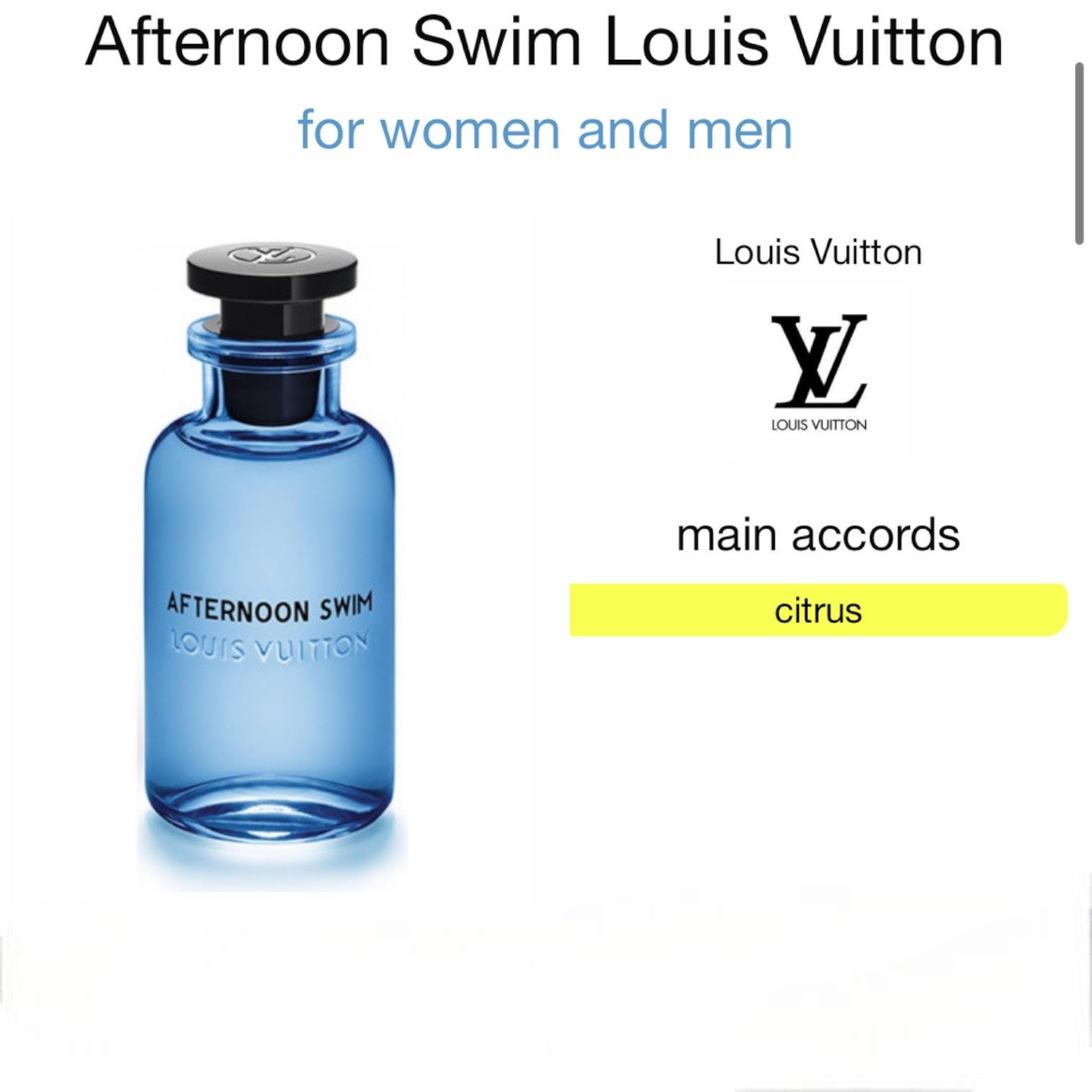 Afternoon Swim by Louis Vuitton is a Citrus fragrance for women and men. Afternoon Swim was launched in 2019. The nose behind this fragrance is Jacques Cavallier.