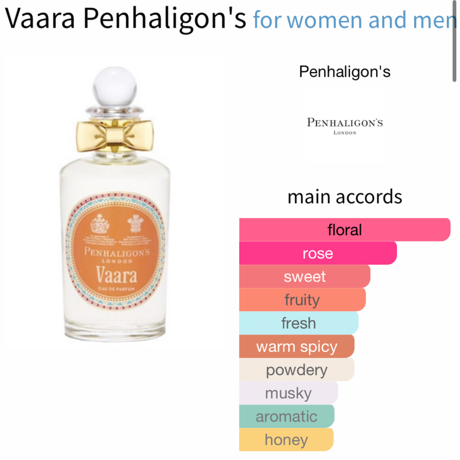 Vaara by Penhaligon's is a Amber fragrance for women and men. Vaara was launched in 2013. The nose behind this fragrance is Bertrand Duchaufour. Top notes are Quince, Rose Water, Saffron, Coriander and Carrot Seeds; middle notes are Rose, Peony, Freesia and Magnolia; base notes are Honey, White Musk, Cedar, Sandalwood, Benzoin and Tonka Bean.