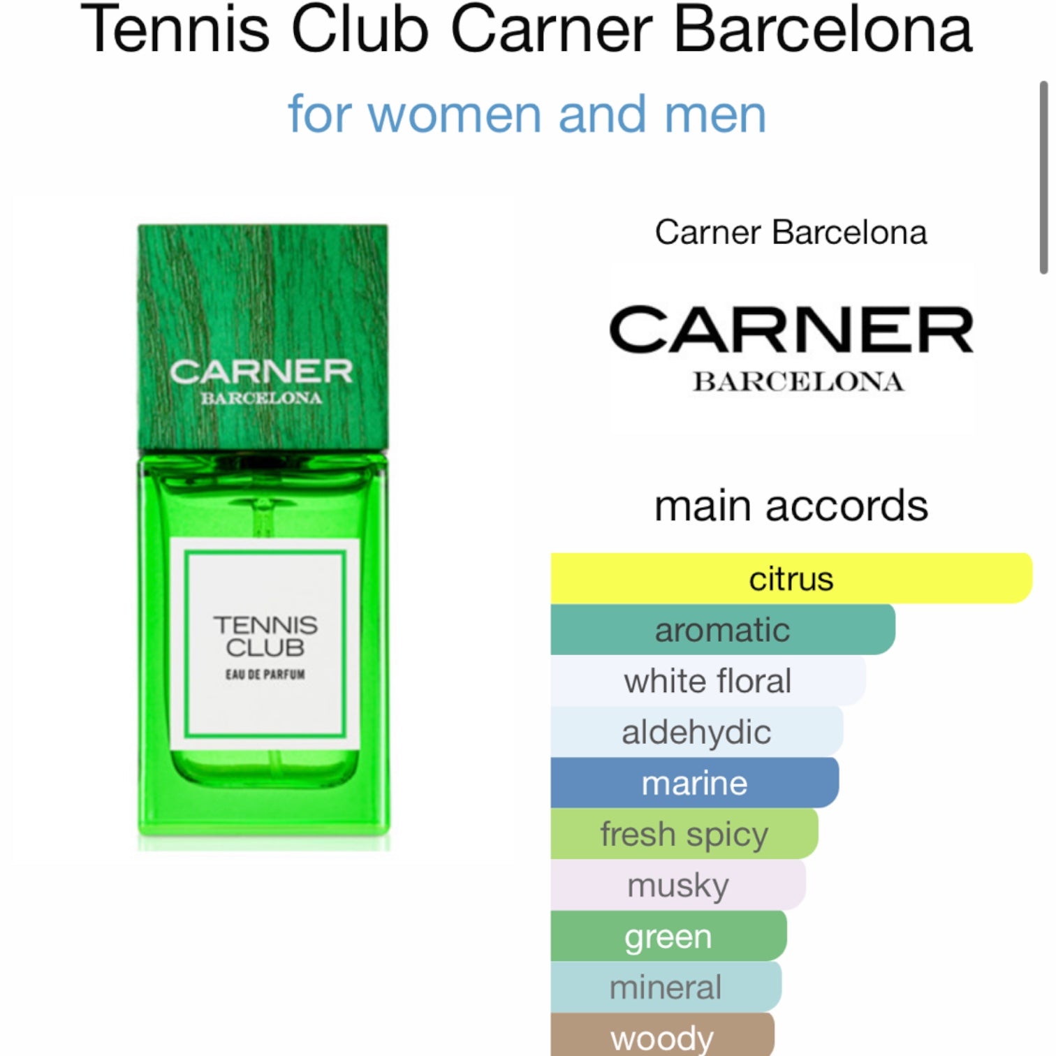 Tennis Club by Carner Barcelona is a fragrance for women and men. This is a new fragrance. Tennis Club was launched in 2022. Top notes are Petitgrain, Bergamot and Blood Orange; middle notes are Sea water, Neroli and Orange Blossom; base notes are Solar Notes, Musk and Cedar.