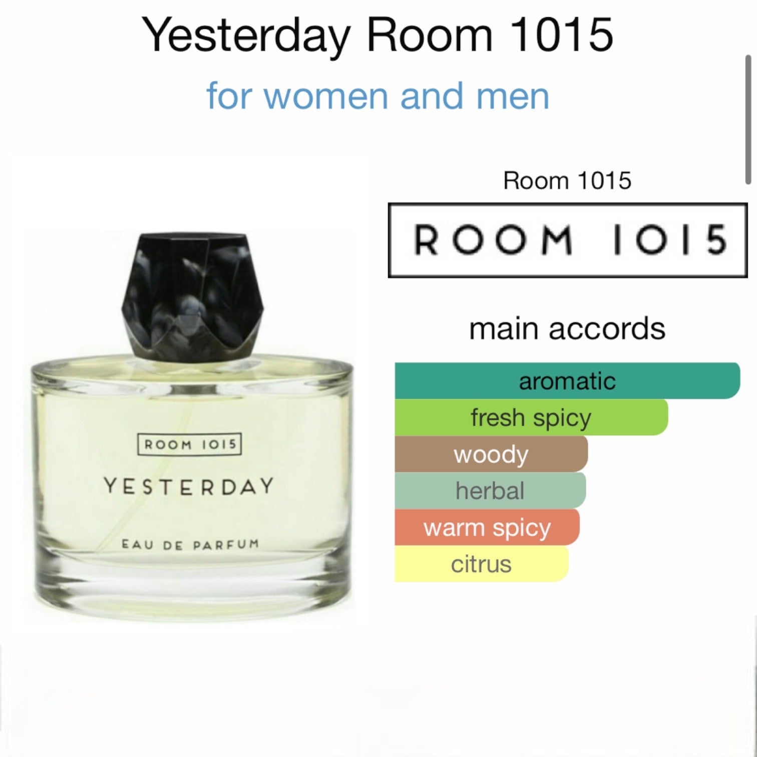 Yesterday by Room 1015 is a Citrus Aromatic fragrance for women and men. Yesterday was launched in 2017. Yesterday was created by Amelie Bourgeois and Anne-Sophie Behaghel. Top notes are Cardamom, Thyme, Bergamot, Orange and Basil; middle notes are Geranium, Lavender, Artemisia and Caraway; base notes are Vetiver, Sandalwood, White Musk, Tonka Bean and Amberwood.