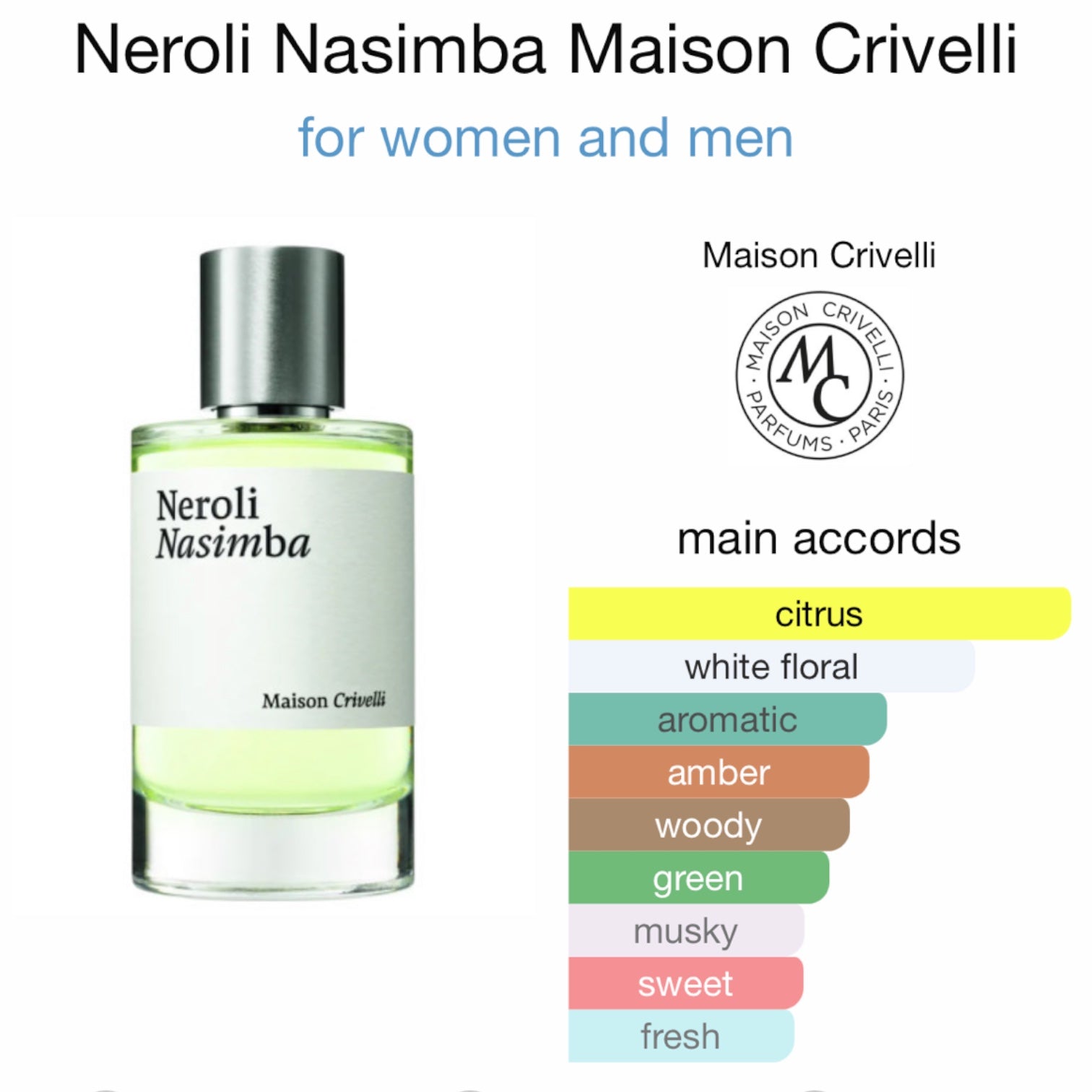 Neroli Nasimba by Maison Crivelli is a fragrance for women and men. This is a new fragrance. Neroli Nasimba was launched in 2023. The nose behind this fragrance is Paul Guerlain. Top notes are Mandarin Orange, Pink Pepper and Cardamom; middle notes are Neroli, Orange Blossom and Petitgrain; base notes are Saffiano Leather, Labdanum and Vetiver.