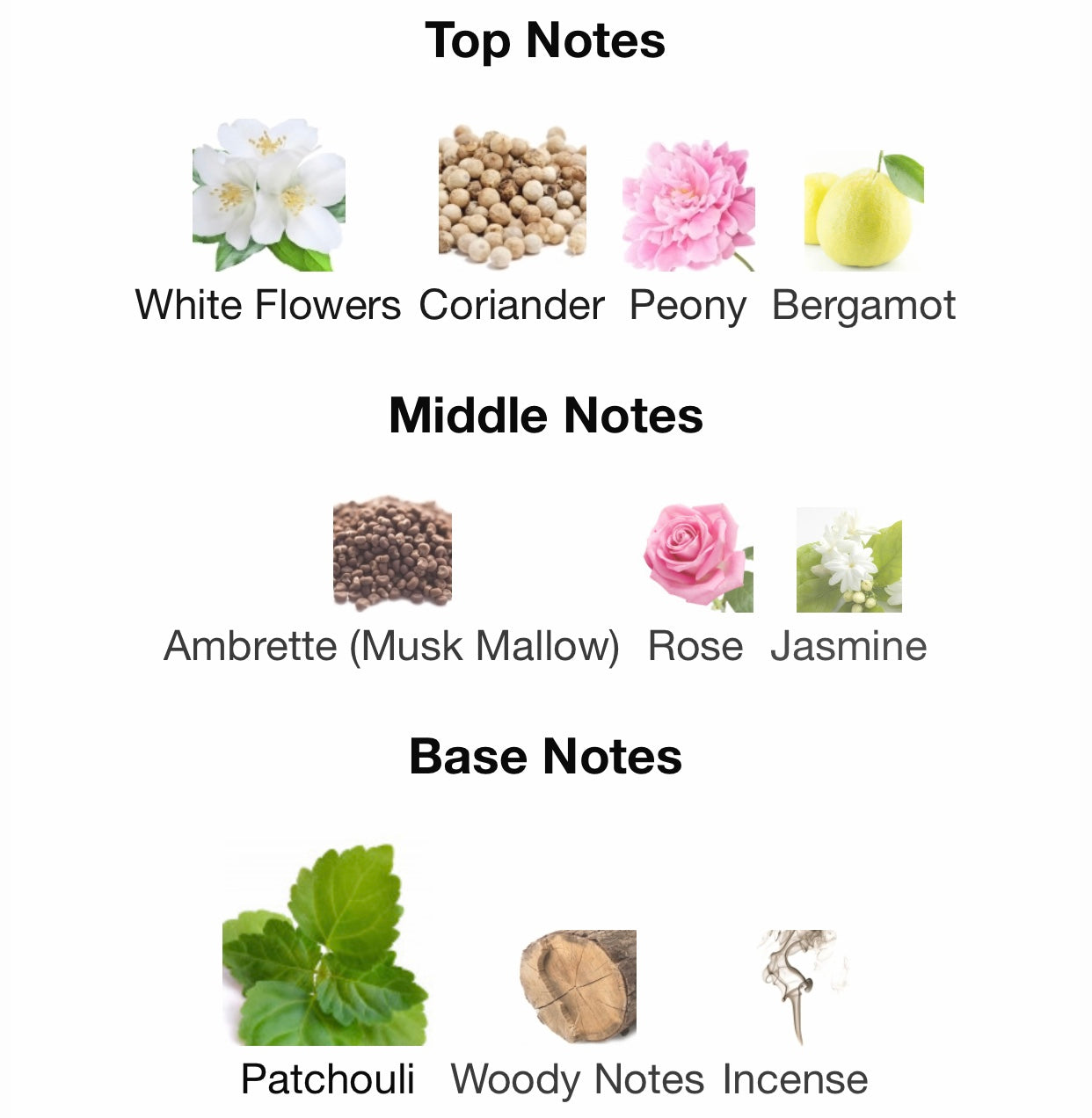 Top notes: Bergamot, Peony, White Flowers, Coriander