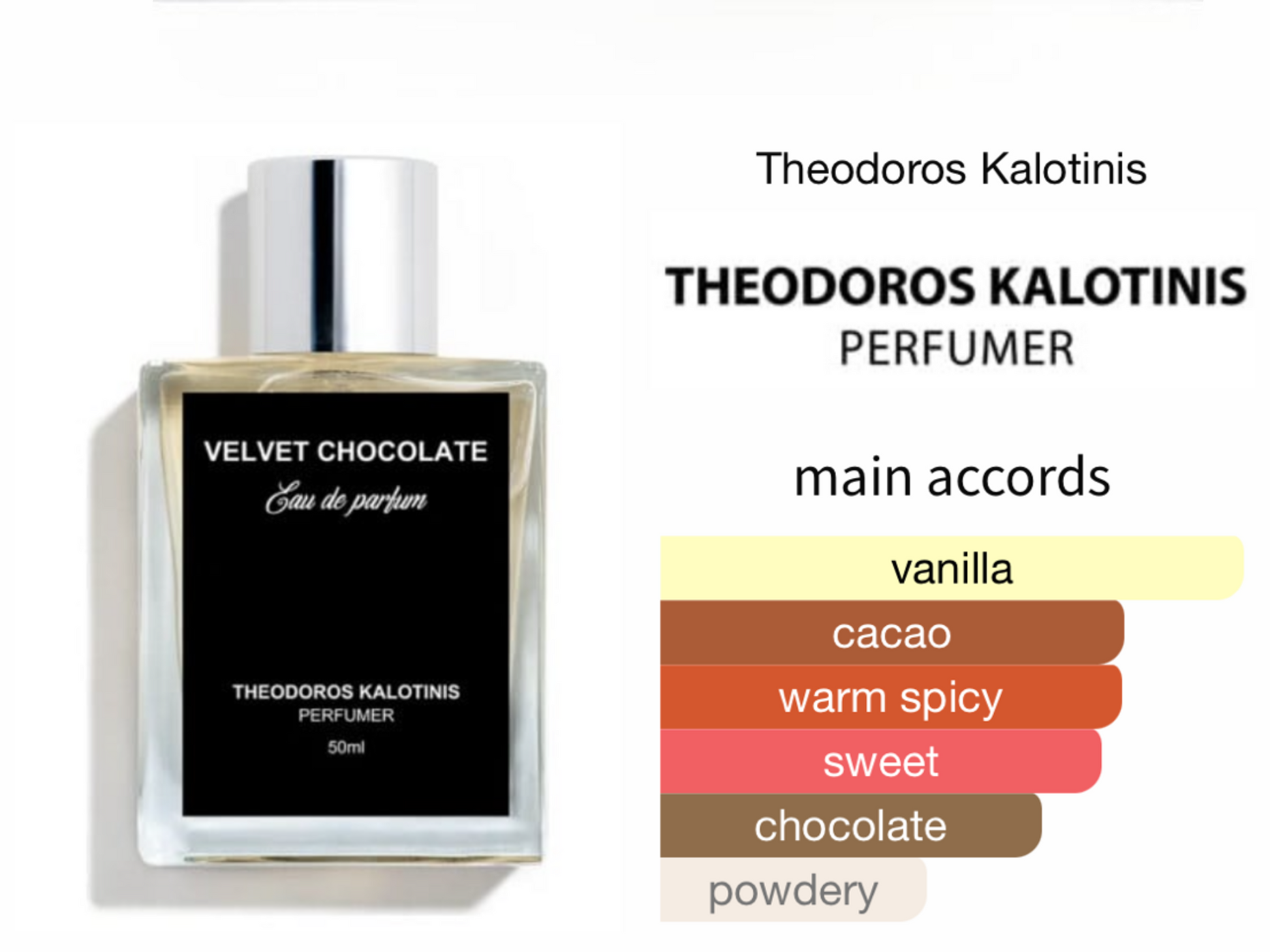 Velvet Chocolate by Theodoros Kalotinis is a Aromatic fragrance for women and men. This is a new fragrance. Velvet Chocolate was launched in 2022. The nose behind this fragrance is Theodoros Kalotinis.